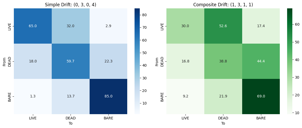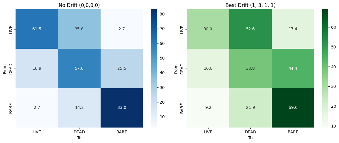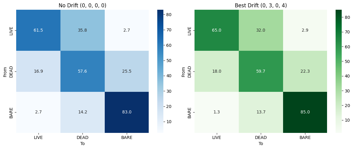 Below are the resulting transition matrices compared to the baseline (no drift):