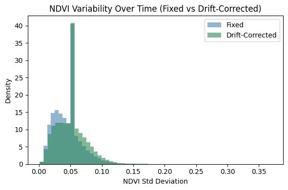 While the mean NDVI variability increased slightly under drift correction, the test remains a useful lens for validating long-term alignment.