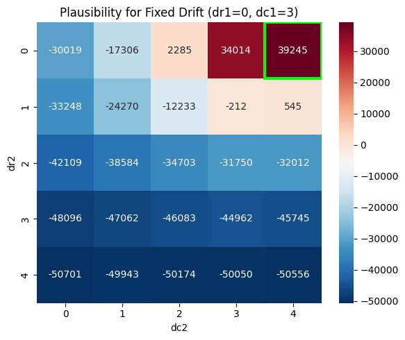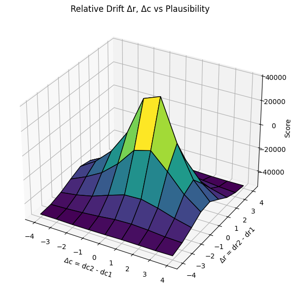 We visualized this in 2D heatmaps (fixed dr1, dc1) and a 3D surface showing plausibility as a function of relative drift ∆r, ∆c.