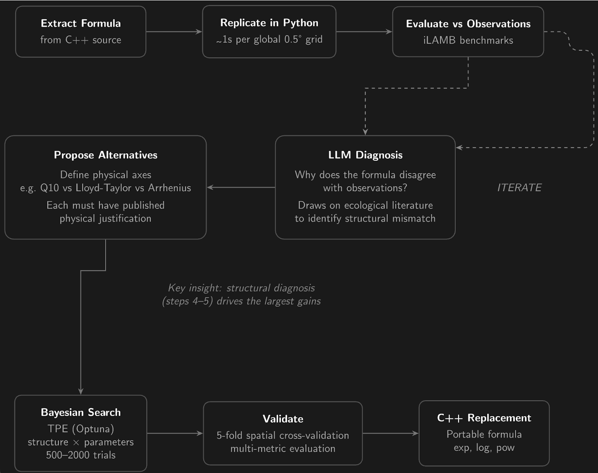 The LLM serves as a diagnostic engine, drawing on the ecological and biogeochemical literature to identify structural mismatches between model assumptions and observed spatial patterns. All formulas are expressed in basic arithmetic operations (exponential, logarithm, power, conditionals) and must be portable to the model’s native C++ implementation. This constraint excludes neural networks, learned embeddings, and any representation that cannot be interpreted in terms of a physical mechanism.