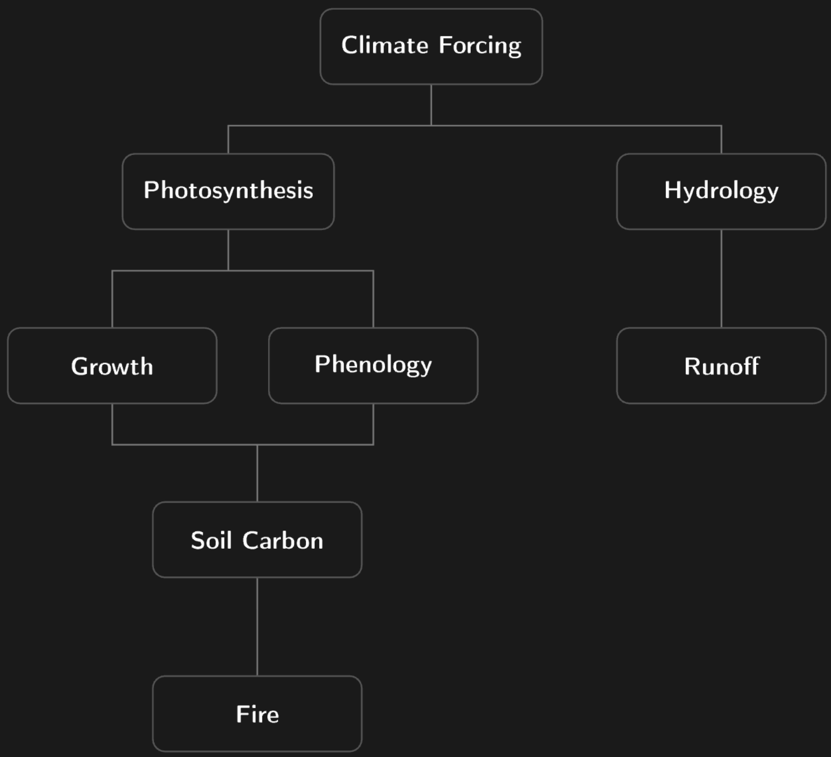 This gap propagates through the entire dependency graph. Absent vegetation means zero litter input to the soil carbon module, zero transpiration in the hydrology module, and zero fuel for the fire module. It represents 19% of global soil carbon stocks as reported by HWSD, a substantial fraction rendered invisible to the model.